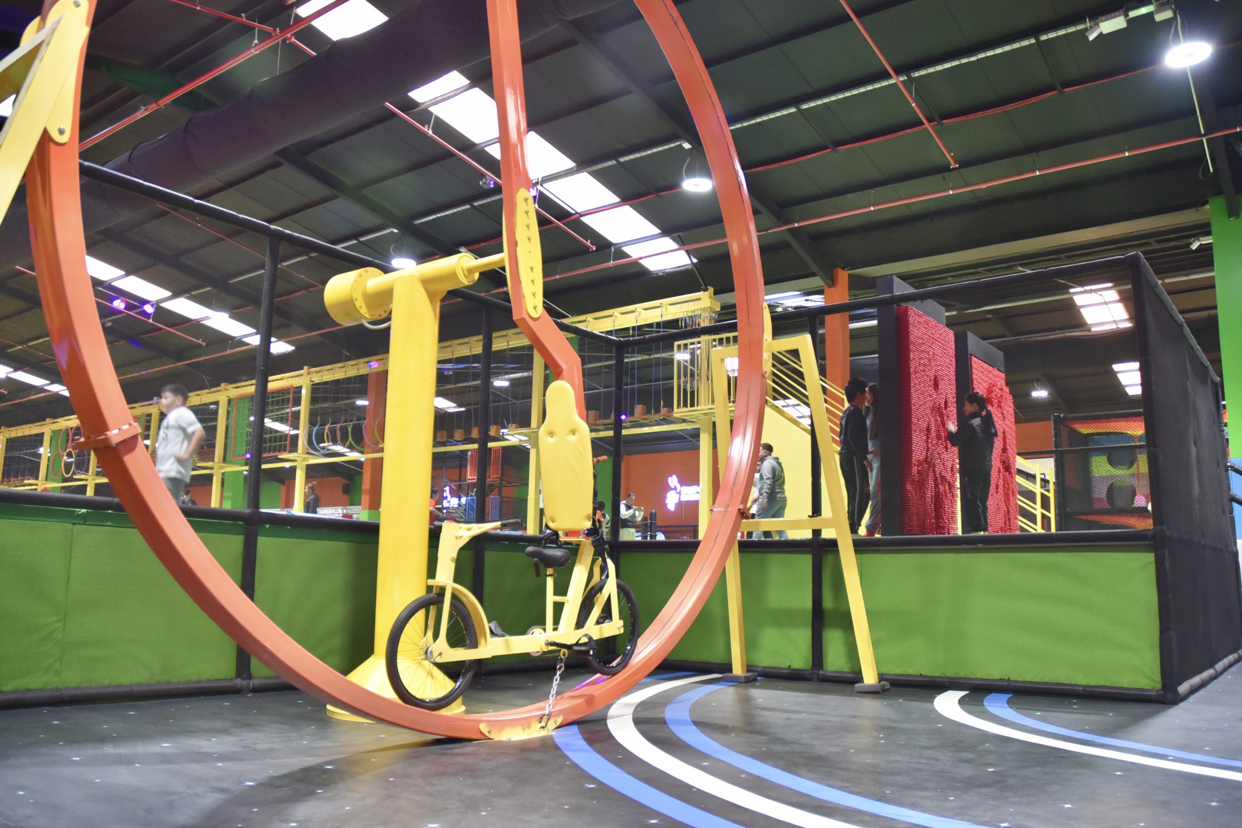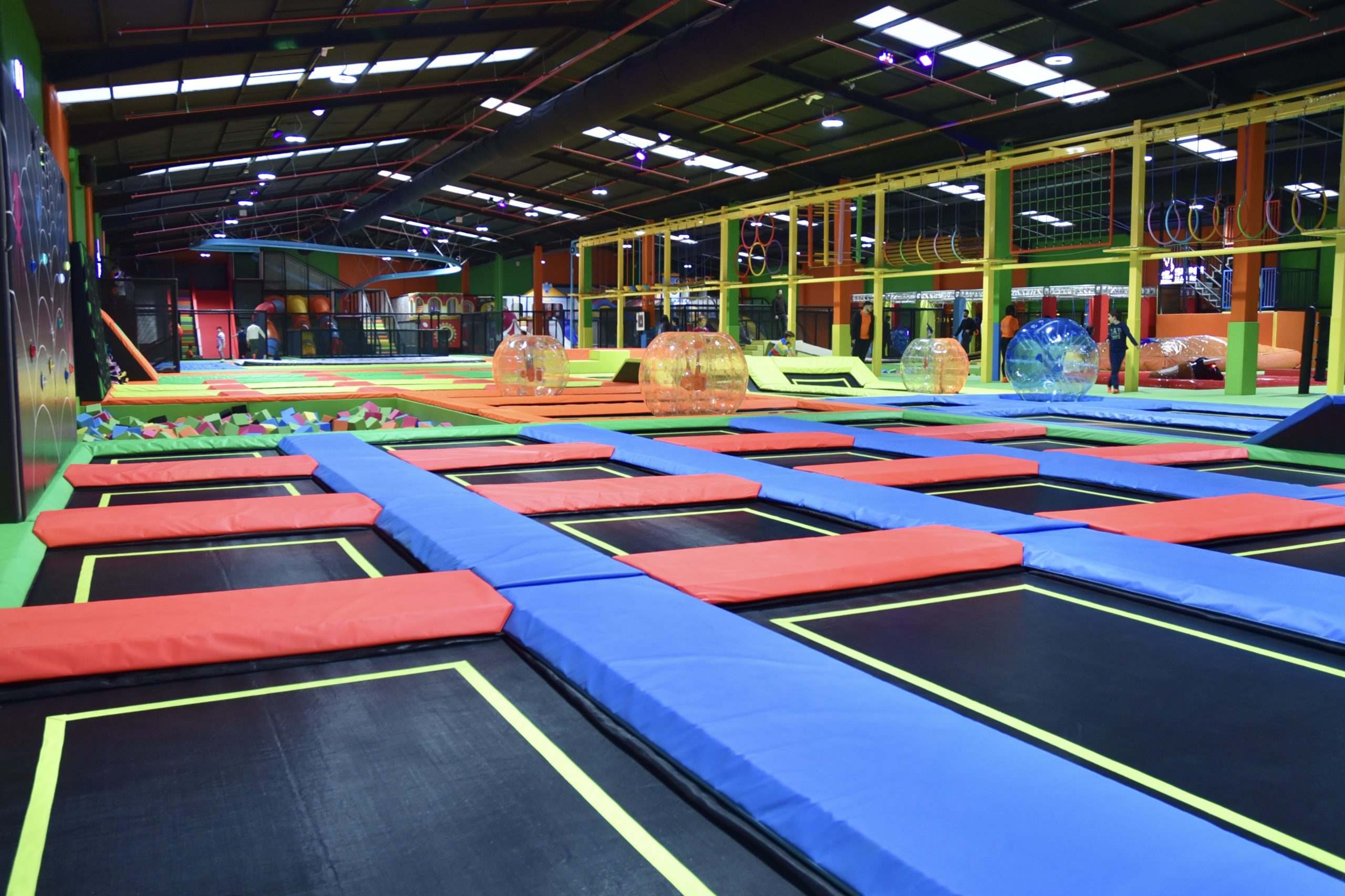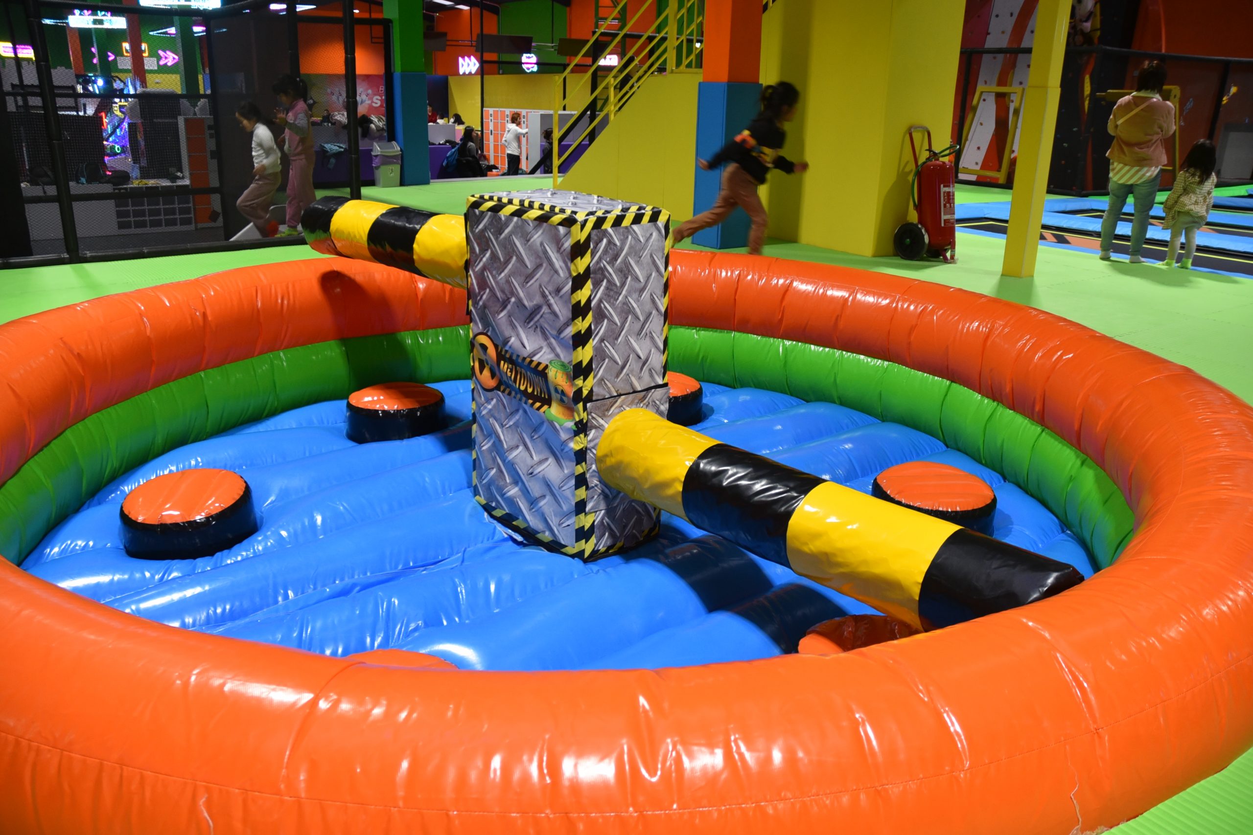 Hay escalada, colchonetas, basquet, boxeo con guantes grandes, minipista de fútbol…muchas zonas de diferentes juegos y bastantes monitores.